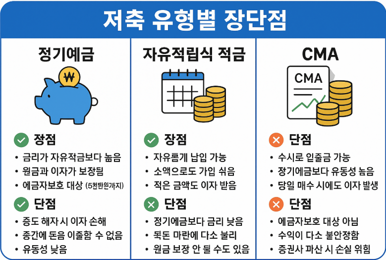 저축은 자산 형성의 가장 기초적인 단계입니다. 하지만 ‘어떻게 저축하느냐’에 따라 자산 증식 속도와 활용도는 크게 달라집니다. 대표적인 저축 유형인 정기예금, 자유적금, 그리고 CMA 계좌는 각각의 특성과 장단점을 지니고 있습니다. 이 글에서는 저축의 세 가지 대표 유형에 대해 비교 분석하고, 어떤 상황에서 어떤 방식이 더 유리한지를 구체적으로 안내해드립니다. 자신의 소득 패턴과 재무 목표에 맞는 저축 방식을 선택하는 것이 재테크 성공의 시작입니다.