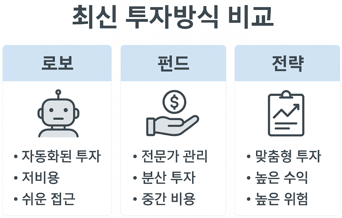 2025년 현재 투자 시장에서는 자동화 기술을 바탕으로 한 로보어드바이저가 빠르게 성장하며 전통적 펀드와의 비교가 더욱 중요해지고 있습니다. 투자 방식, 비용 구조, 리스크 관리, 시장 대응 속도 등 다양한 요소에서 두 방식은 뚜렷한 차이를 보입니다. 본 글에서는 2025년 기준 최신 데이터를 중심으로 자동화 투자와 전통 펀드의 특징을 심층적으로 분석하고, 투자자 유형에 따른 선택 전략까지 제안합니다. 특히 초보 투자자와 장기 투자자 모두가 실질적으로 참고할 수 있도록 실제 운용 방식과 비용 구조의 차이를 자세히 정리해 드립니다.